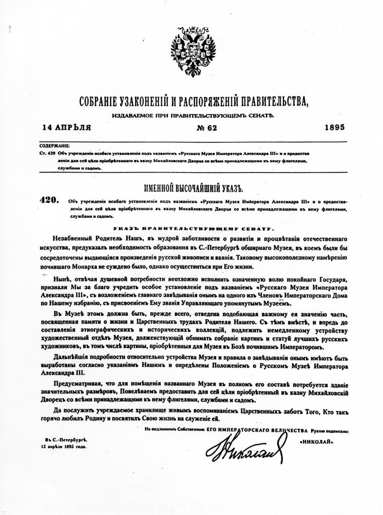 Это первый в стране государственный музей русского изобразительного искусства. Решение о его основании было принято императором Александром III. В 1895 г. Николай II подписал указ «Об учреждении особого установления под названием „Русского Музея Императора Александра III“ и о представлении для сей цели приобретенного в казну Михайловского дворца со всеми принадлежащими к нему флигелями, службами и садом». В мае того же года началась перестройка дворцовых помещений для будущих музейных экспозиций (арх. В.Свиньин). 3 мая 1895 года утверждено «Положение о музее».
